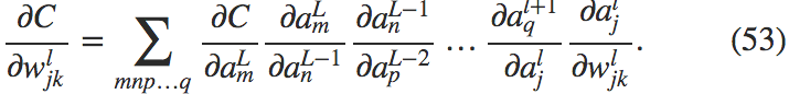 现在公式(53)看起来相当复杂。但是,这里其实有一个相当好的直觉上的解释。我们用这个公式计算 $C$ 关于网络中一个权重的变化率。而这个公式告诉我们的是:两个神经元之间的连接其实是关联与一个变化率因子,这仅仅是一个神经元的激活值相对于其他神经元的激活值的偏导数。从第一个权重到第一个神经元的变化率因子是 $\partial a_j^l/\partial w_{jk}^l$。路径的变化率因子其实就是这条路径上的众多因子的乘积。而整个的变化率 $\partial C/\partial w_{jk}^l$ 就是对于所有可能的从初始权重到最终输出的代价函数的路径的变化率因子的和。针对某一个路径,这个过程解释如下,