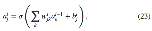 有了这些表示, $l^{th}$ 层的 $j^{th}$ 个神经元的激活值 $a_j^l$ 就和 $l^{th}$ 层关联起来了(对比公式(4) 和上一章的讨论)